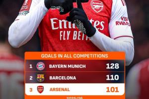 據(jù)LiveScore統(tǒng)計,阿森納成為本賽季歐洲五大聯(lián)賽第三支達成百球里程碑的球隊,僅次于拜仁和巴薩。