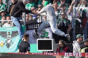在昨晚進行的第25輪德乙聯(lián)賽,普魯士明斯特主場1-2負(fù)于柏林赫塔。上半場補時階段,主隊在禁區(qū)內(nèi)疑似犯規(guī),主裁判來到場邊觀看VAR視頻回放。此時一名普魯士明斯特球迷蒙面翻越護欄闖進球場,并拔掉了VAR顯示器的電源插頭,以此干擾主裁判的執(zhí)法。