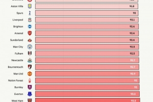 Opta超級計算機列英超剩余賽程難易度榜單(數(shù)值越高越難):