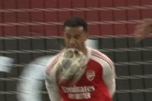 體育資訊03月12日訊 歐冠1/8決賽首回合,阿森納客戰(zhàn)勒沃庫(kù)森,第22分鐘,加布里埃爾用臉擋住對(duì)手射門。