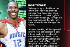 體育資訊03月13日訊 今日,2025年奈史密斯籃球名人堂成員、2004年NBA狀元秀、2019-20賽季NBA總冠軍&3屆DPOY(2009、2010、2011年)&5屆NBA一陣(2008-2012年)&4屆最佳防守陣容一陣(2009-2012年)&8次入選全明星陣容8次(2007-2014年)、5次籃板王(2008、2009、2010、2012、2013年)、2次蓋帽王(2009、2010年)德懷特·霍華德在自己的個(gè)人社媒發(fā)布長(zhǎng)文宣布退役。