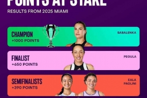 體育資訊3月13日訊 WTA官方盤點了WTA1000邁阿密站的保分情況,其中衛(wèi)冕冠軍薩巴倫卡需要保住1000分,中國選手鄭欽文、波蘭名將斯瓦泰克需要保住八強的215分。