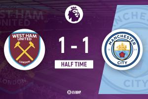 上半場傷停補(bǔ)時2分鐘,半場結(jié)束,曼城暫1-1西漢姆聯(lián)。