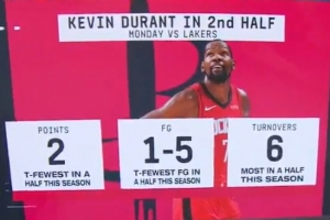 KD上場打湖人下半場僅命中1球得2分平賽季最低 6失誤賽季最多!