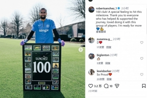桑切斯社媒曬出與百場(chǎng)里程碑紀(jì)念品的合照,配文:“100場(chǎng)比賽!達(dá)成這一里程碑的感覺(jué)真特別,感謝一路上給予幫助和支持的每個(gè)人,喜歡與這群隊(duì)友并肩作戰(zhàn)的感覺(jué),我已準(zhǔn)備好迎來(lái)更多比賽。”