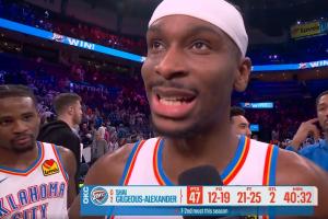 本場比賽,亞歷山大出戰(zhàn)41分鐘,投籃19中12,三分3中2,罰球25中21,拿到47分5籃板3助攻2搶斷。