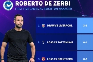 德澤爾比自2022年9月起擔(dān)任布萊頓主帥,上任后的前五場(chǎng)英超比賽,布萊頓戰(zhàn)平了利物浦與諾丁漢森林,輸給熱刺、布倫特福德、曼城。
