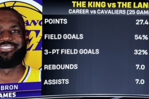 湖人主場迎戰(zhàn)騎士,轉(zhuǎn)播方曬出詹姆斯生涯VS騎士數(shù)據(jù)統(tǒng)計(25場):
