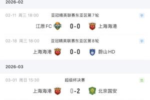 2026年海港進行了3場正式比賽,亞冠兩場均為0-0平,本場0-2負(fù),三場比賽都沒有進球入賬。