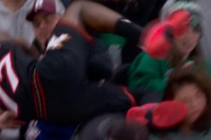GIF-埃奇庫姆救球不小心踢到女球迷 后者直接掛彩 VJ趕緊來抱抱安慰下