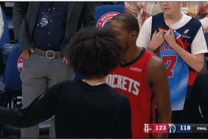 賽后,杜蘭特在場邊指導(dǎo)奇才的年輕前鋒凱肖恩·喬治。