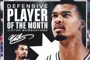 體育資訊3月4日訊 今日NBA官方宣布,2月份西部月最佳球員和月最佳防守球員均為馬刺球星文班亞馬!