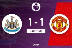上半場(chǎng)補(bǔ)時(shí)3分鐘,紐卡1-1曼聯(lián)。