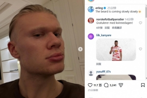 在社交媒體上,哈蘭德延續(xù)了自己一貫不茍言笑的風(fēng)格,他曬出了自拍照并寫道:胡須一點(diǎn)點(diǎn)長(zhǎng)出來(lái)了。