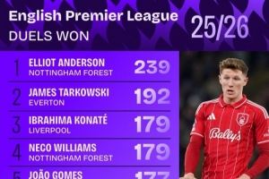 體育資訊3月9日訊 Squawka統(tǒng)計了本賽季球員在英超的對抗成功次數(shù),并列出榜單,安德森是唯一對抗成功超過200次的球員。