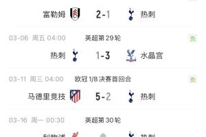 熱刺歐冠1/8決賽首回合2-5慘敗馬競(jìng),下周一周內(nèi)將連續(xù)對(duì)陣?yán)锲帧ⅠR競(jìng)(次回合)、森林。