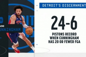 上一場比賽坎寧安26投5中僅得16分,活塞主場103-114不敵馬刺