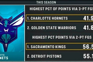 本賽季黃蜂三分命中數(shù)占比聯(lián)盟最多 國(guó)王兩分命中數(shù)占比聯(lián)盟最多