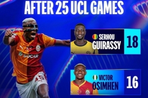 數(shù)據(jù)統(tǒng)計顯示,奧斯梅恩(尼日利亞)在25場歐冠后打進(jìn)16球,也超越了藍(lán)軍傳奇德羅巴(科特迪瓦)的同期數(shù)據(jù)(15球),在非洲球員中僅次于18球的吉拉西(幾內(nèi)亞)。