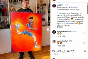 佩德里獲贈一幅畫作,內(nèi)容為他身穿西班牙國家隊球衣的形象,佩德里社媒曬出這幅畫作,配文:“西班牙國家隊的五年時光,所有回憶凝聚于此刻?;厥淄率嵌嗝疵篮?,自2021年3月25日在格拉納達的那個日子以來,我們經(jīng)歷了太多,包括一座歐洲杯冠軍,以及另外一次歐洲杯和世界杯的征程。感謝這份厚禮,這簡直是一件藝術品!”