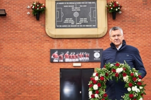 體育資訊3月26日訊 在拜仁慕尼黑女足對陣曼聯(lián)女足的女足歐冠比賽開球前幾小時,拜仁慕尼黑俱樂部主席海納代表這支德甲冠軍球隊,敬獻了一個帶有俱樂部顏色的花圈,以悼念1958年2月6日慕尼黑空難的遇難者。