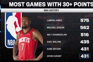 偉大的得分手!杜蘭特生涯30+場次追平科比 并列歷史第5!