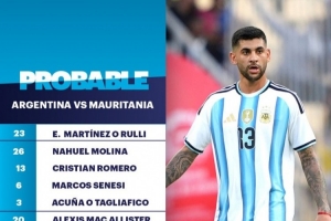 體育資訊3月27日訊 北京時(shí)間明天7點(diǎn)15分,阿根廷將在友誼賽中對陣毛里塔尼亞,TYC預(yù)測了阿根廷隊(duì)的首發(fā)陣容。