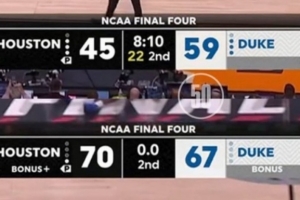 ESPN數(shù)據(jù)顯示,終場前3分03秒,杜克以64-55領(lǐng)先,當(dāng)時(shí)他們的勝率高達(dá)95.2%,但隨后藍(lán)魔進(jìn)攻斷電!最后33秒,休斯敦轟出9-0進(jìn)攻高潮極限翻盤。
