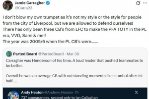 緊接著球迷Parted Beard發(fā)文反駁Heaton:“卡拉格就是他那個時代的亨德森。一個嗓門大的領袖,會推著隊友變得更好。但總體來說他只是個平庸的中衛(wèi),高光時刻只有伊斯坦布爾之夜半場后的大逆轉(zhuǎn)……”
