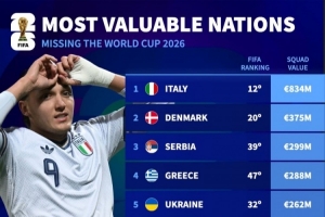體育資訊4月2日訊 德國轉(zhuǎn)會(huì)市場(chǎng)列出了無緣世界杯球隊(duì)身價(jià)排名,意大利8.34億歐居首,丹麥、塞爾維亞二三位。