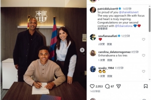 體育資訊4月2日訊 克魯伊維特更新社媒動態(tài),曬出18歲兒子肖恩與巴薩B隊續(xù)約的照片。