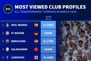 體育資訊4月3日訊 德國轉(zhuǎn)會(huì)市場統(tǒng)計(jì)了3月份俱樂部頁面的瀏覽量,并列出榜單,皇馬居首,巴薩、拜仁排名二三位。