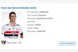 體育資訊04月04日訊 巴西足協(xié)官網(wǎng)的球員注冊(cè)系統(tǒng)中顯示,34歲奧斯卡與圣保羅已于當(dāng)?shù)貢r(shí)間4月2日解除合同!