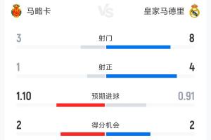 體育資訊04月04日訊 西甲第30輪馬略卡vs皇馬上半場戰(zhàn)罷,馬略卡暫時(shí)1-0領(lǐng)先,以下為雙方半場數(shù)據(jù)對(duì)比: