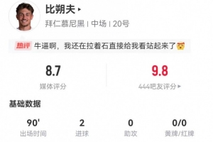 體育資訊4月4日訊 拜仁在本輪德甲3-2逆轉(zhuǎn)弗賴堡,比朔夫本場數(shù)據(jù)如下: