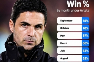 阿爾特塔執(zhí)教阿森納各個(gè)月份勝率(勝率從高到低排序):