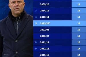 以下為新世紀(jì)以來利物浦單賽季輸球場次榜: