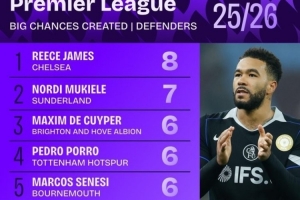 體育資訊4月6日訊 squawka統(tǒng)計了本賽季英超后衛(wèi)的創(chuàng)造重大機會情況,藍軍隊長里斯·詹姆斯領跑。