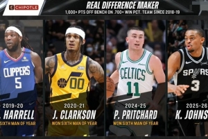 轉(zhuǎn)播方曬出一組數(shù)據(jù)圖片:自2018-19賽季以來,替補球員單賽季砍下至少1000分且球隊勝率70%以上的球員有: