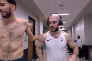 賽后卡魯索接受ESPN采訪,霍姆格倫光著膀子路過。巴克利調(diào)侃道:“告訴切特穿上衣服。他的身材還不夠好,不配光著膀子到處走?!?/p>