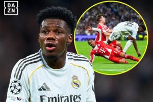 體育資訊04月08日訊 歐冠1/4決賽首回合,皇馬主場(chǎng)1-2不敵拜仁,瓊阿梅尼第36分鐘絆倒奧利塞、撞翻基米希,吃到黃牌次回合停賽。