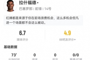 體育資訊4月9日訊 巴薩在本輪歐冠0-2落后馬競,拉什福德本場數(shù)據(jù)如下: