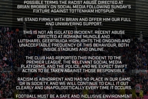 我們堅(jiān)定地與布羅比站在一起,并向他提供我們?nèi)媲覉?jiān)定不移的支持。這不是一起孤立事件。近期針對羅曼·蒙德爾和海特勒伊達(dá)的辱罵行為,突顯了這種無論在球場內(nèi)還是網(wǎng)絡(luò)上仍在發(fā)生且頻率令人無法接受的行徑。