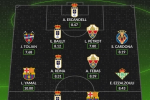 體育資訊4月14日訊 西甲第31輪戰(zhàn)罷,數(shù)據(jù)網(wǎng)站W(wǎng)hoscored也評(píng)選出本輪比賽評(píng)分最高陣容,其中亞馬爾滿(mǎn)分10分領(lǐng)銜,具體如下: