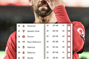 在西甲積分榜上,位居第10的西班牙人拿到38分,而位居第18 的埃爾切則拿到32分,也就是說(shuō)第10和第18僅有6分的差距。因此,從第10到第18都有降級(jí)的可能性。