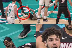 在第二節(jié)的一次進(jìn)攻倒地后,黃蜂球星拉梅洛·鮑爾順勢抓到了熱火內(nèi)線阿德巴約的腳踝,致使后者失衡重摔在地,隨后返回更衣室。