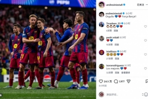 巴薩傳奇中場(chǎng)伊涅斯塔社媒曬出球員們的賽場(chǎng)合照,鼓勵(lì)后輩,配文:“驕傲,加油巴薩!”