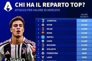 體育資訊4月16日訊 德轉(zhuǎn)按后衛(wèi)+門將、中場、前鋒統(tǒng)計(jì)意甲各隊(duì)球員身價(jià),前鋒球員總身價(jià)中,尤文以2.31億歐居首,國米第二,米蘭第三。