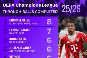 本賽季歐冠成功直塞傳球榜:奧利塞8次居首,亞馬爾7次第二