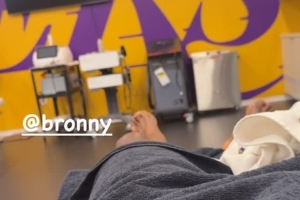 詹姆斯曬出他和兒子布朗尼都早早(洛杉磯時間早上8點(diǎn)40點(diǎn)左右)來到湖人訓(xùn)練館的理療師接受理療并準(zhǔn)備參加訓(xùn)練的自拍畫面,并寫道:“早起的鳥兒??有蟲??吃!@布朗尼”